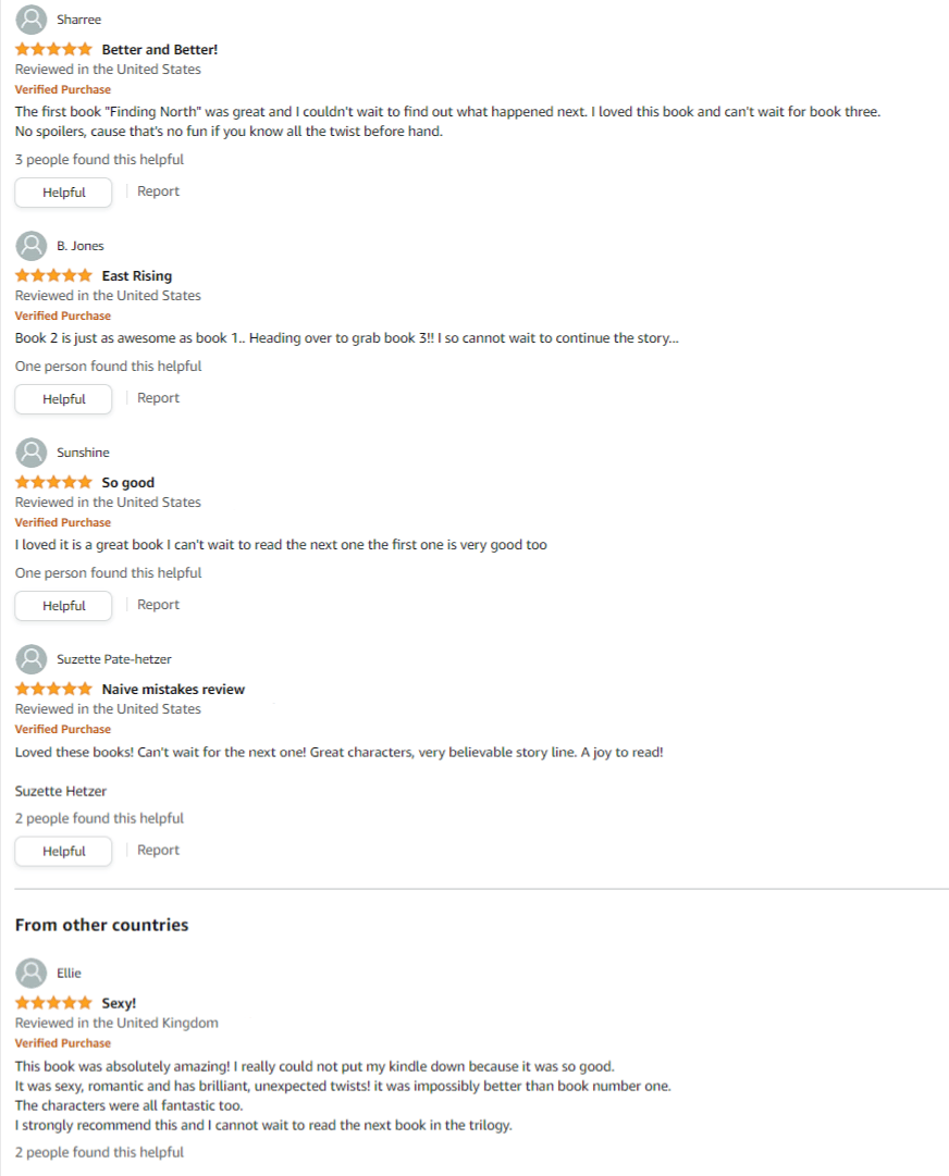 - “Loved these books! Can’t wait for the next one! Great characters, very believable story line. A joy to read!” ~ Amazon Review